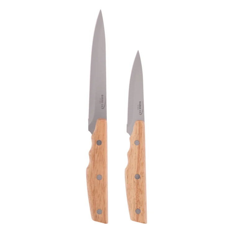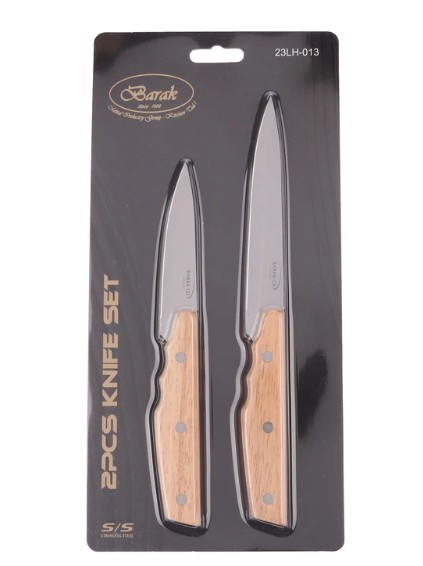 این محصول شامل 2 عدد چاقو با تیغه استیل ضد زنگ و دسته چوبی که موجب راحتی کار و طول عمر بالای چاقو ها میگردد میباشد. ابعاد چاقوی بزرگ 24*3*2 سانتی متر با طول تیغه 14 سانتی متر و ابعاد چاقو کوچک 20*3*2 با طول تیغه 10سانتی متر بوده که هر دو چاقو از مهم ترین چاقو های مورد نیاز در هر آشپزخانه ای میباشند این چاقوها مناسب برای برش انواع میوه و سبزیجات و برش گوشت برای تکه های خورشتی و یا کبابی است.یکی دیگر از ویژگی های بسیار مهم این محصول سبک بودن این چاقو ها به دلیل جنس دسته آنها است که سبب جلوگیری از خستگی دستان در استفاده طولانی مدت میشود.