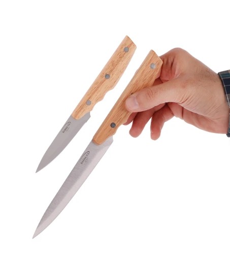 این محصول شامل 2 عدد چاقو با تیغه استیل ضد زنگ و دسته چوبی که موجب راحتی کار و طول عمر بالای چاقو ها میگردد میباشد. ابعاد چاقوی بزرگ 24*3*2 سانتی متر با طول تیغه 14 سانتی متر و ابعاد چاقو کوچک 20*3*2 با طول تیغه 10سانتی متر بوده که هر دو چاقو از مهم ترین چاقو های مورد نیاز در هر آشپزخانه ای میباشند این چاقوها مناسب برای برش انواع میوه و سبزیجات و برش گوشت برای تکه های خورشتی و یا کبابی است.یکی دیگر از ویژگی های بسیار مهم این محصول سبک بودن این چاقو ها به دلیل جنس دسته آنها است که سبب جلوگیری از خستگی دستان در استفاده طولانی مدت میشود.